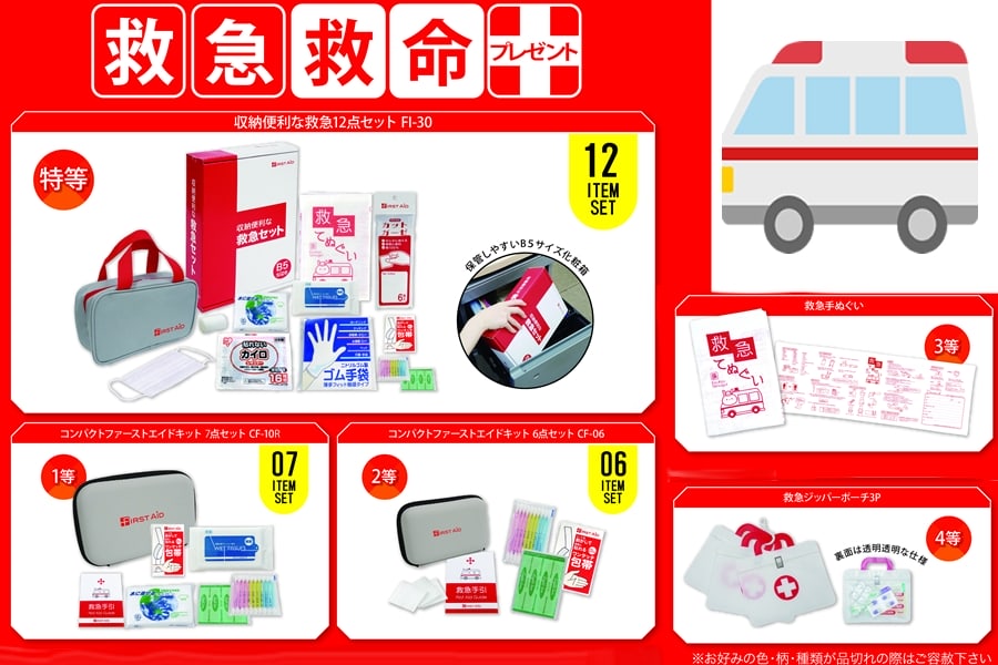 あったら絶対便利な救急キットの抽選グッズ。特等は14点から12点になりました。
