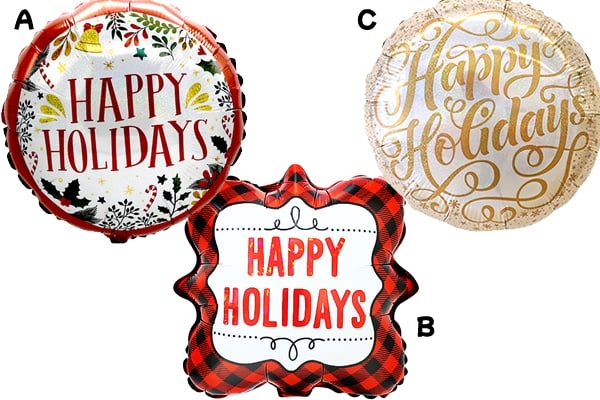 「ハッピーホリデー」メッセージ入りクリスマス風船。冬シーズン全体で使えるUFO型タイトルバルーンです。他にもメリークリスマス風船などもあります。