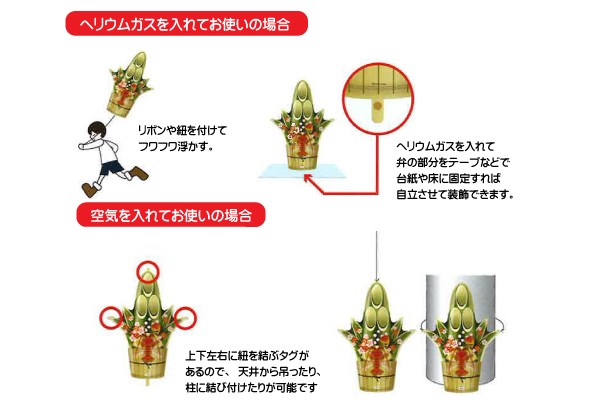 お正月の飾りに風船の門松はいかがでしょう。風船タイプで風船ポンプで空気を再度注入すれば何度でも使えます。空気を入れた場合は本物の門松のように下に置くことができます。ヘリウムの場合はリボンを短くして浮かせて使ってもおもしろい。お正月向けの販促グッズです。