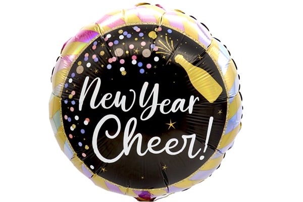 シャンパン噴き出しデザインの「18インチ オパール ニューイヤーチアー」バルーン(5枚入り)。年末年始のイベントやパーティー装飾に映えるおしゃれなUFO型バルーン。