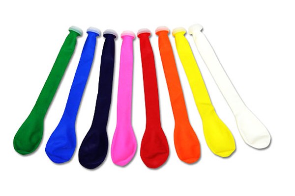 8色アソートのロケット風船は笛がついている縦長風船。膨らましてはなすと音が出る楽しいゴム風船です。他にも
