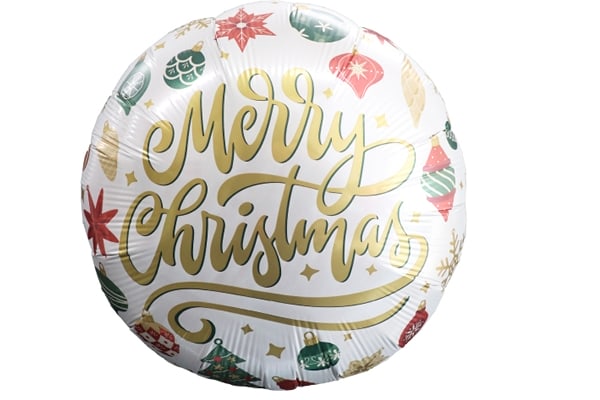 白地にオーナメント柄が映える「サテンクリスマスヴィンテージオーナメンツ」UFO型フィルム風船。
