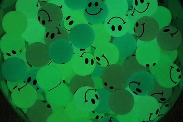 蓄光で光るニコニコフェイス柄の27mmスーパーボール。イベントや縁日に最適な100個入りセット。