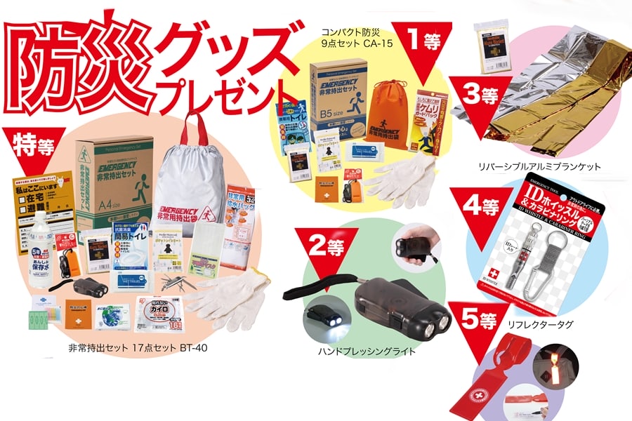 特等:非常持出袋(難燃ポリエステル巾着)、マルチナイフ、防災用ウェットティッシュ、ホイッスル、LEDダイナモライト、3L給水袋、防災の心得、軍手、マスク、5年保存水500ml、使い捨てカイロ、アルミブランケット、綿棒&絆創膏、水に流せるペーパー、緊急避難カード、レインコート、抗菌消臭トイレ