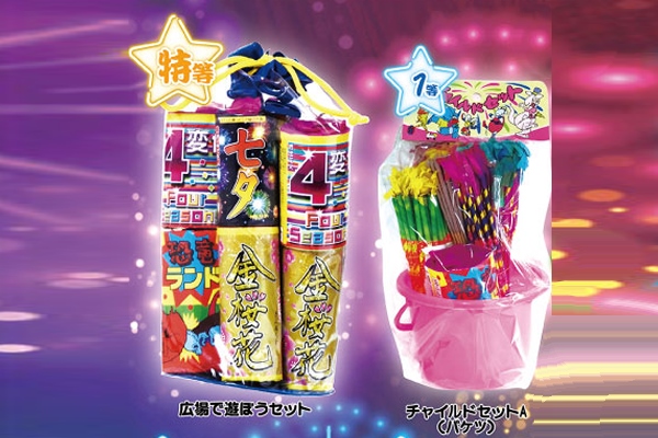 小さなお子様でも安心の手持ち花火が中心となった花火セット。町内会や子供会などの景品なら仲良し花火セットがおすすめ。