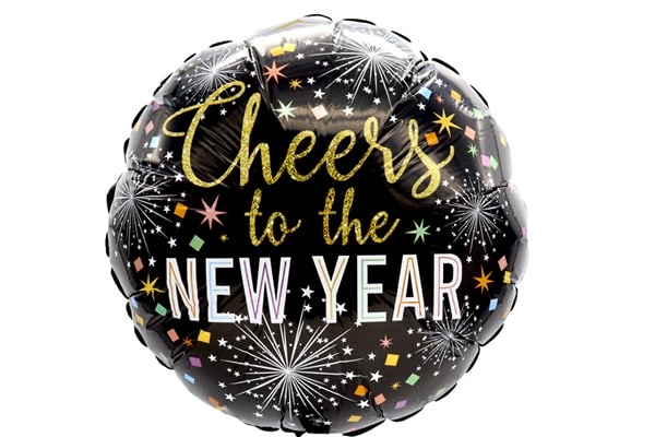 花火と紙吹雪デザインの「18インチ チアーズ トゥー ニューイヤー パーティ」バルーン。新年イベントやカウントダウンパーティーに最適な華やかUFO型バルーン(5枚入り)。